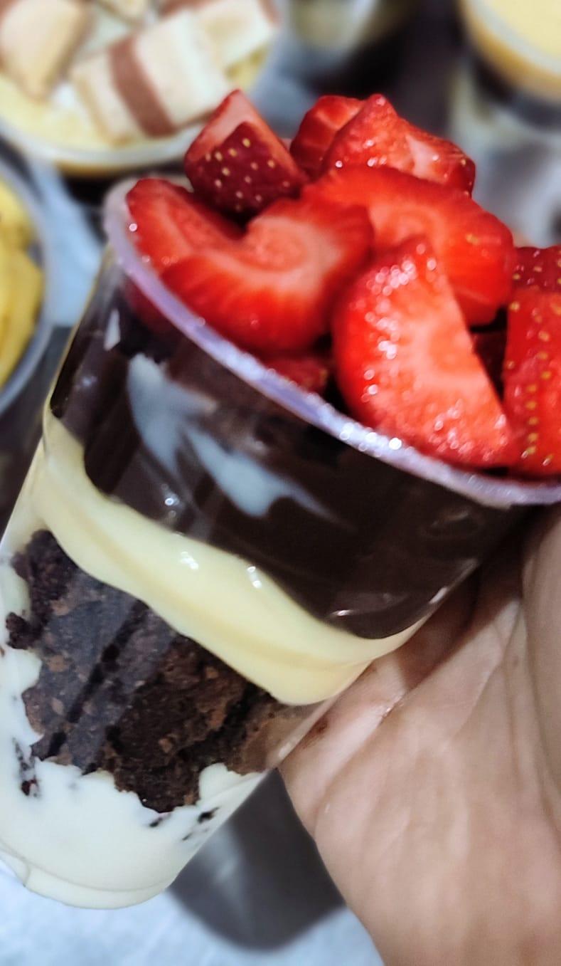 MOUSSE DE NINHO, BROWNIE, BRIGADEIRO DE NINHO, BRIGADEIRO DE CHOCOLATE 50% E MORANGOS FRESCOS PICADOS